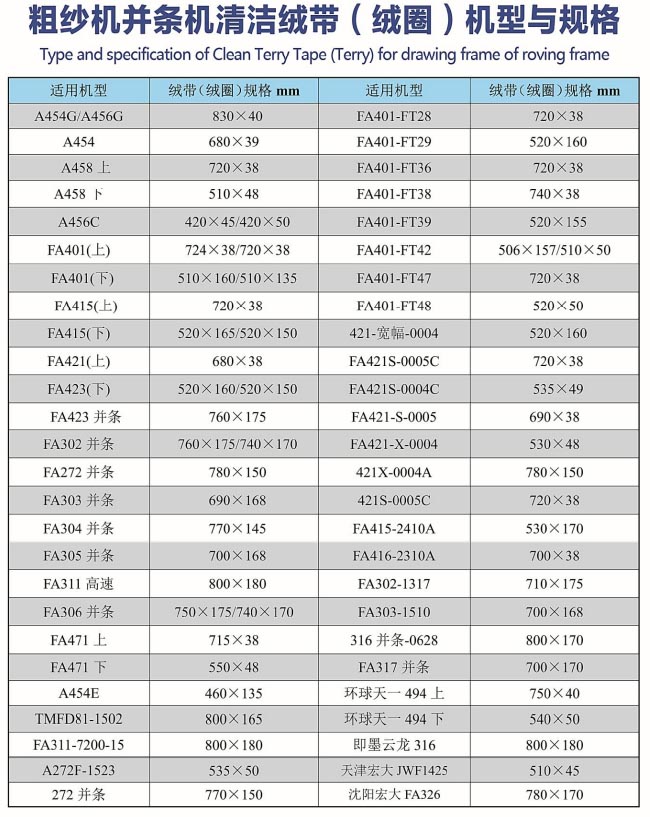 我公司降重推出第九代新型高科技納米材料,粗紗機(jī)、并條機(jī)清潔絨帶(絨),真正做到了無靜電、抗靜電、無熒光、永不拉長(zhǎng)、四條絨帶在清潔器上運(yùn)轉(zhuǎn)平穩(wěn)一致,而且不起棉結(jié)、清花效果比羊毛(白呢)和尼龍絨毛植絨帶提高了2倍,清花效果中有利的把附著在膠輥和羅拉上的短絨、飛花、雜質(zhì)清掉,使粗紗干條大大減少了游羽、圈羽現(xiàn)象,永不拉長(zhǎng)節(jié)約了停機(jī)次數(shù),為粗紗車間每年節(jié)省用工17-21個(gè)工期,提高了效率,為紡織廠節(jié)省了開支。從前的絨帶全部有熒光,第九代絨帶真正做到了無熒光,在現(xiàn)代紡紗中,提倡紗線的綠色健康熒光實(shí)際就是化工化學(xué)產(chǎn)品而造成的,我們采用意大利進(jìn)口白棕樹棕毛,經(jīng)過12道工序制作當(dāng)前絨化,又開發(fā)了先進(jìn)的植絨機(jī)器,讓絨毛和底布結(jié)合的更牢固,如果絨帶上有熒光,就造成了絨帶和羅毛,拉摩擦產(chǎn)生靜電、起棉結(jié)現(xiàn)象,棉結(jié)落到粗紗干上,造成了很大的瑕疵,還有棉紗上有熒光,大大影響了染色有瑕疵、有異纖。新型高科技納米材料絨帶,它降低紗疵、提高成紗質(zhì)量,從而達(dá)到******高立,提高產(chǎn)品******化。